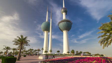 KUWAIT - CIRCA MARCH 2017: The Kuwait Towers timelapse hyperlapse - the best known landmark of Kuwait City. Kuwait, Middle East. View with palms and flowerbed, blue cloudy sky before sunset