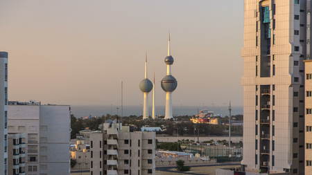 Skyline with Skyscrapers day to night transition timelapse in Kuwait City downtown illuminated at dusk. View from scientific center with reflection on water. Kuwait City, Middle East.