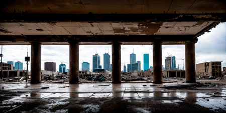 Abandoned, completely destroyed big city - a metropolis with skyscrapers. The concept of the end of the world, disaster and destruction - apocalypse. Generative AI