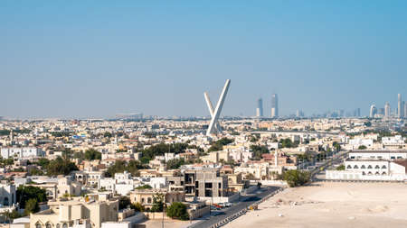 Beautiful view of a part of Katara Cultural Village of Qatar showing skysrapers, paved pathway, ocean and blue sky. Empty area of Katara, Qatar.