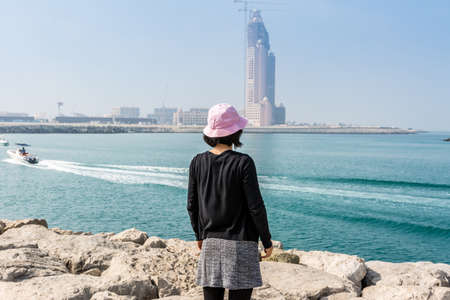 A Chinese young woman looking at the coastline with background of construction site of skylines in Abu Dhabi, United Arab Emirates