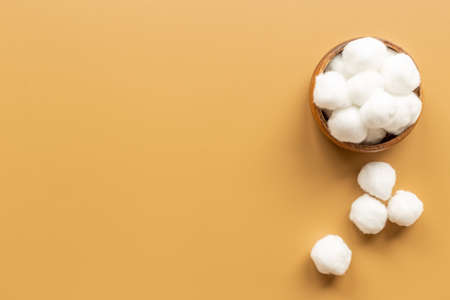 Delicate soft cotton balls in bowl. Cosmetic makeup remover supplies
