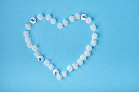 pharmacology medical concept pyramid of white pills tablets drugs on cyan surface with copyspace