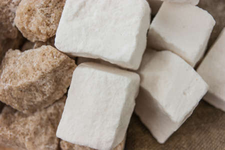 close up of White sugar cubes. The concept of unhealthy eating. Top view, Place for text, copyspace.