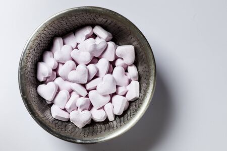 Colorful marshmallow laid out on pink paper background. pastel creative textured pattern. Perspective macro shot.