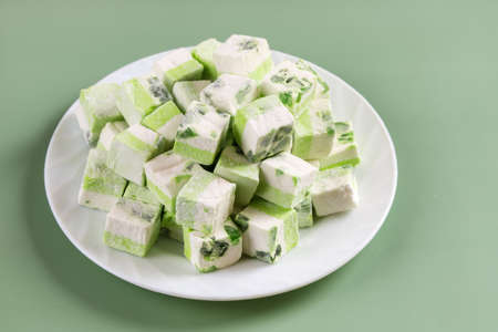 Marshmallow cubes, green kiwi fruit sweet dessert on white plate close-up