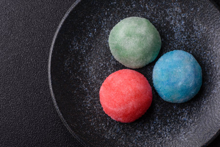 Delicious colorful asian mochi sweets with rice dough shell and fruit filling on dark concrete background