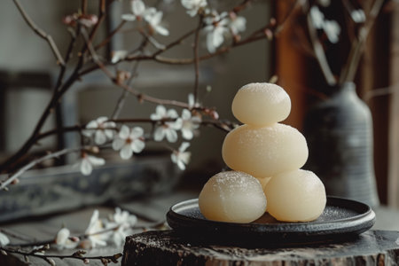 Artful Mochi Stack with Floral Ambiance. Snowy mochi tower delicately balanced, with vibrant floral backdrop and subtle spices