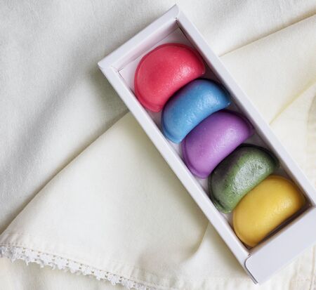 Japanese mochi, ice cream or Asian sweets made from rice flour with fruit filling. Mochi of different colors with fruit filling as food background