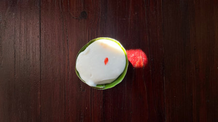 delicious japanese cuisine dessert mochi cakes with butter cream and chocolate with bumbuka leaves