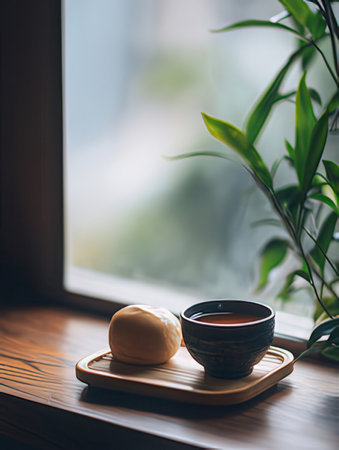 A cup of tea and a bun on a wooden tray on the windowsill