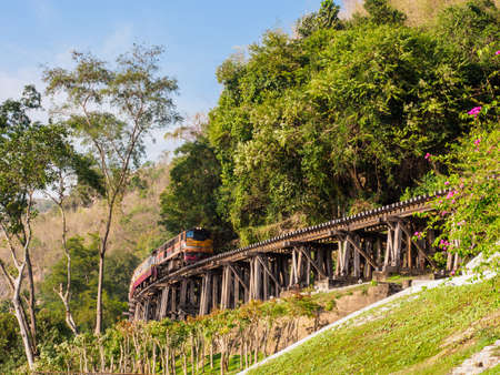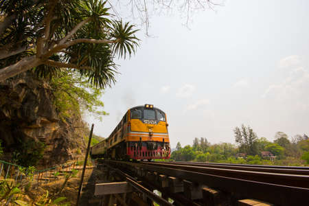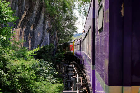 The train traveling along historic Death Railway which was built by the Allied prisoners of war under the captivity of Japanese army during the World War II.