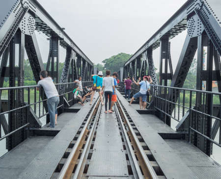 Kanchanaburi , Thailand- 16 Feb, 2023: Tourists walk on the River Kwai Bridge or Death railway bridge in Kanchanaburi, Thailand. It was part of the meter-gauge railway constructed by the Japanese during WW 2