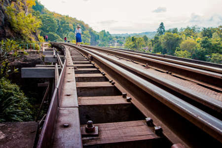 Kanchanaburi, Thailand - October 12, 2019: People on railway to see and photo train on bridge across river Kwai Khwae in early morning. Here is famous travel landmark for history of World war2.