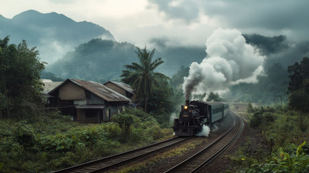 A beautiful scene capturing a vintage steam train departing through lush Lao landscapes, surrounded by mountains and misty skies, evoking a sense of adventure.