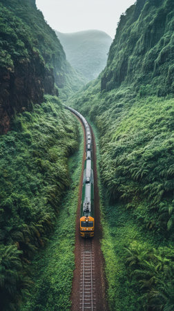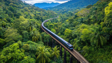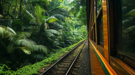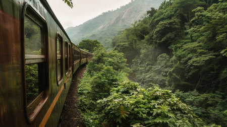 Experience a breathtaking train journey through a vibrant forest, showcasing lush greenery and magnificent mountains. A perfect blend of nature and adventure.
