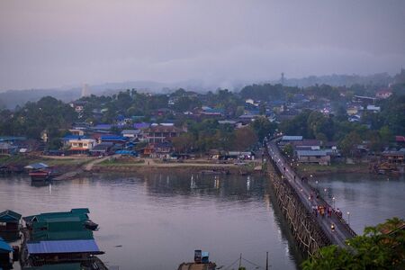 Aerial top view of Mon Bridge with residential local houses in Mon village, nature trees, Sangkhlaburi, Kanchanaburi, Thailand in urban city town in Asia, buildings.