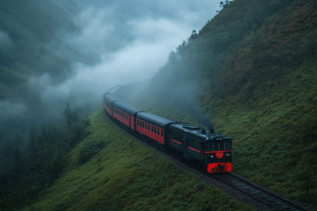 A vintage train winds through a lush green landscape enveloped in mist. The gentle curves of the track complement the serene ambiance, creating a tranquil escape into nature.