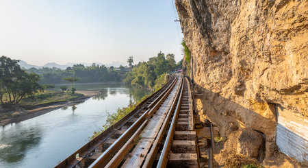 The Death Railway Bridge, constructed using the labor of prisoners of war, under the Japanese occupying army during World War 2, with wood and iron supports, against a high cliff face.