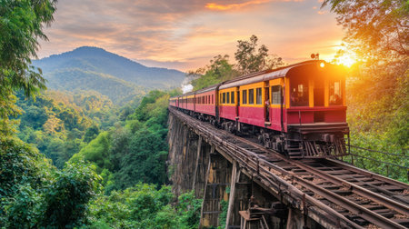 A vibrant train travels across a wooden bridge, surrounded by lush green mountains and a stunning sunset, inviting adventure through nature's beauty.