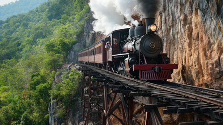 Vintage locomotives train on track running through mountain cliff. Excursions travel in Thailand.