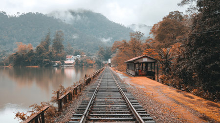 This stunning landscape features railway tracks leading to a serene lake, surrounded by lush hills and misty mountains, embodying peaceful autumn beauty and tranquility.