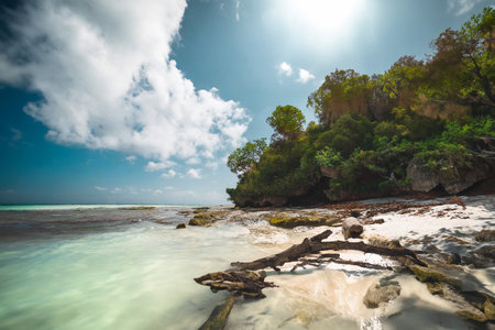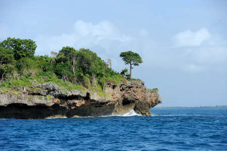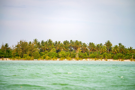 Seascape with background mangrove trees on the tropical coast of Zanzibar island.