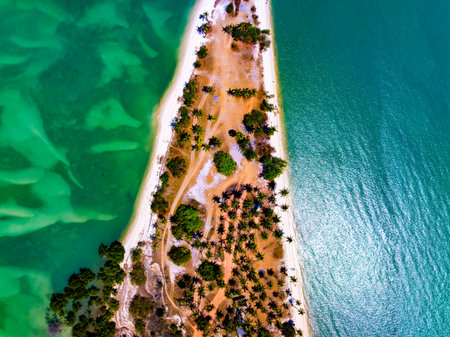 An aerial shot of coastline and seabed of Zanzibar Island, Tanzania, Africa