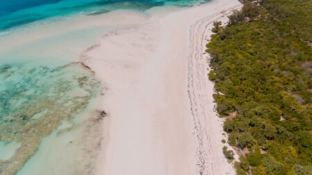 Aerial view of beautiful tropical island Daco with white sand beach. View of a nice tropical beach from the air. Sea, resort. Seascape: Ocean and beautiful beach paradise. Philippines. Travel concept.