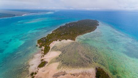 Aerial view of a tiny offshore sandbar and tropical coral reef (White Island)