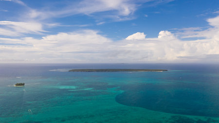 Tropical island with beautiful beach, palm trees and turquoise water view from above. Guyam island, Philippines, Siargao. Summer and travel vacation concept