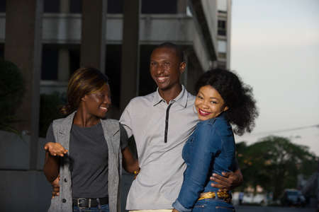 Group of young people walking on the street. three friends having fun and talking outdoors