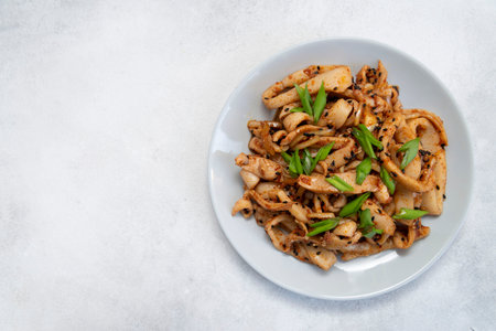 Seafood salad of squid on the gray plate. Macro. On gray background. korean dish.asian dish.