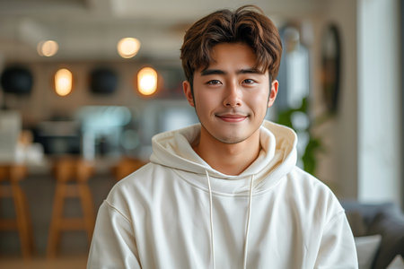 An Asian man wearing a white hoodie is standing in a room with a minimalist design, the focus is on his portrait with a close-up shot, and a blurred background.