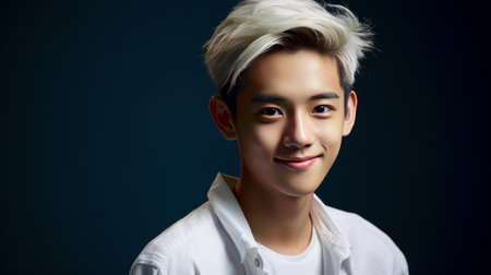 Young adult handsome Asian man portrait, male model with dark hair studio shot, background with copy space, diversity and different beauty concept, AI generated