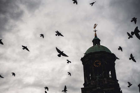 a church in amsterdam is always surrounded by pigeons