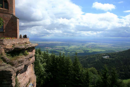 View on Alsace Valley from peak Mountain Vosges. Mont Sainte-Odile Abbey in Alsace, France. Vosges Mountains.