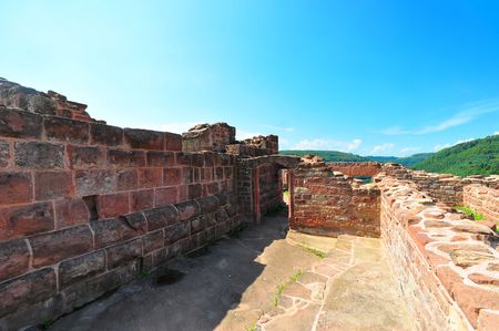 View to the medieval Trifels castle over a rock wall