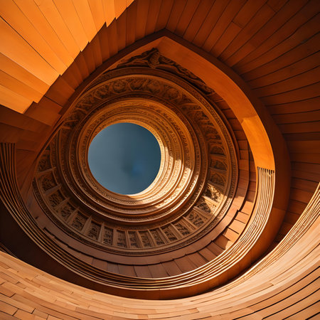 Captivating view from below showcasing a stunning glass dome and elegant staircase, highlighting intricate architectural details in a historical setting.