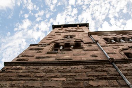 Frog's eye view of the red tower of St. John's church in Maastricht, Netherlands