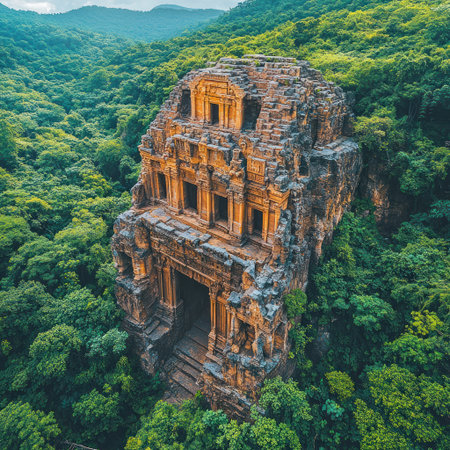 Sunlight highlights an ancient temple hidden in the dense forest, exuding mystery.