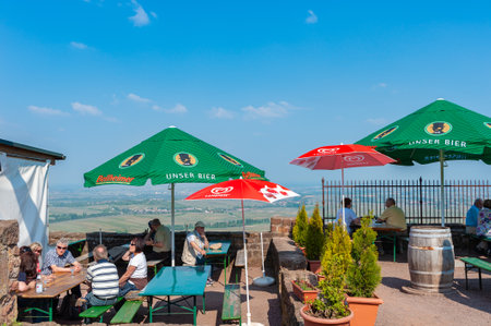 Eschbach, Germany - April 22, 2022 Beer garden in the inner courtyard of the ruins of Madenburg near Eschbach. Region Palatinate in the federal state of Rhineland-Palatinate in Germany