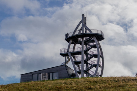 Bottrop, Germany - July 29th 2018: People walking on the mine dump around the Tetrahedron in Bottrop. The steel structure, an example of alternative Architecture, is a popular tourist attraction.