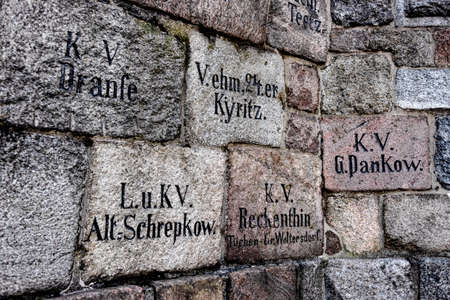 Germany, Pritzwalk, Trappenberg: Detail of famous Bismarck tower (Bismarckturm) with historic inscriptions names of donators on exterior wall - concept monument history travel. December 30, 2018