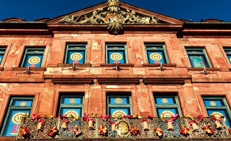 Freiburg im Breisgau, Germany - December 31, 2017: Architectural detail of a typical historic downtown town house on a winter day