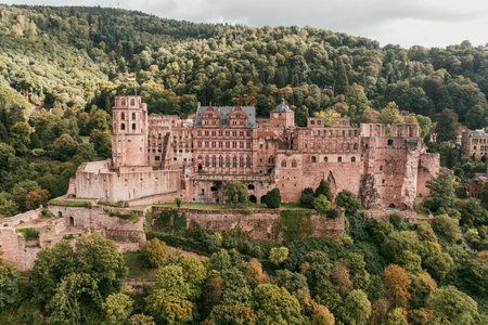 Gorgeous aerial view on the historic castle in Heidelberg, Germany. The old large fortress is a famous old landmark surrounded by a scenic forest.