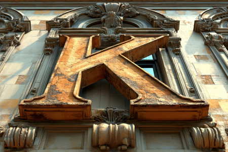 The letter K is large and orange, and it is on a building. The building has a lot of detail, including a window and a window frame