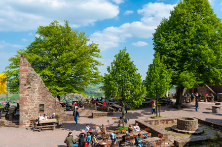 Eschbach, Germany - April 22, 2022 Beer garden in the inner courtyard of the ruins of Madenburg near Eschbach. Region Palatinate in the federal state of Rhineland-Palatinate in Germany