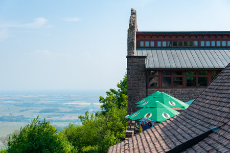 Eschbach, Germany - April 22, 2022: View from the ruins of Madenburg near Eschbach to the Upper Rhine Plain. Region Palatinate in the federal state of Rhineland-Palatinate in Germany