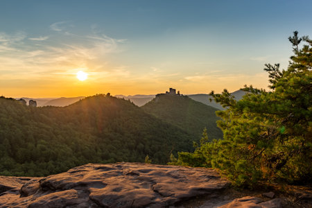 Anweiler, Germany – August 30, 2023: Trifels Castle seen from Rock Slevogtfelsen during Sunset, Rhineland-Palatinate.
